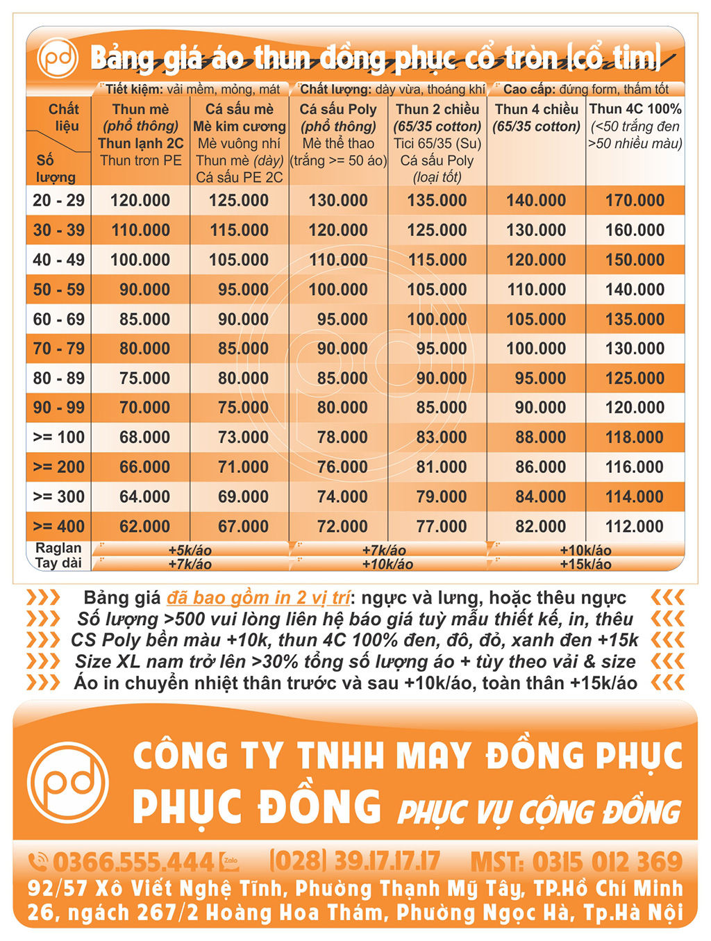 Như quí khách đã tham khảo qua bảng giá in áo phông nhiều nơi, chúng tôi biết bạn có rất nhiều lựa chọn, xin cảm ơn đã an tâm tin tưởng và chọn Phục Đồng làm nhà cung cấp áo phông đồng phục cho công ty thông qua các loại vải theo xu hướng thịnh hành và mới nhất của xưởng may áo phông giá rẻ với bảng báo giá quá đầy đủ rành mạch.